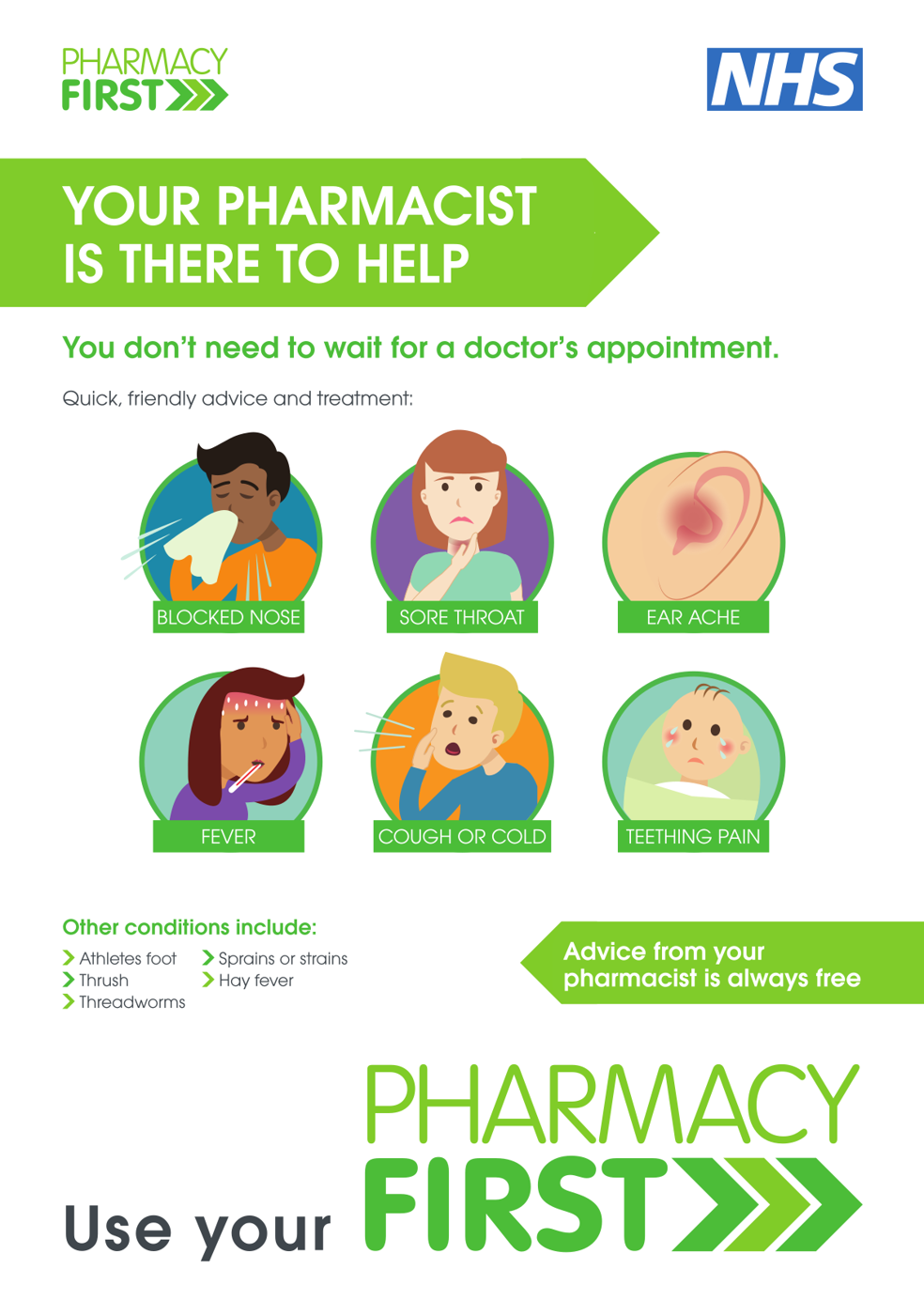 The Pharmacy First service allows patients to access advice and treatment for common conditions directly from a community pharmacy, without needing to see a GP.